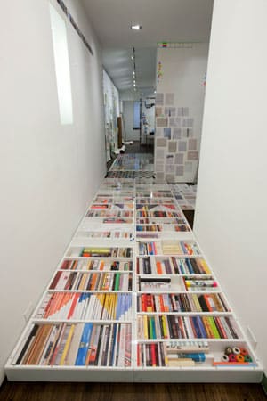 Exploring forms and ideas that consider the near infinite cycle of recombination, Evans uses painting, text, performance, and collaboration to present open system environments that are both symbiotic and cannibalistic. The title of the exhibition is a humorous play on words, as the artist loosely recreated his New York studio, located on Houston Street, within the gallery walls of DiverseWorks in Houston, TX, bridging these two disparate locations through art. Imagining the two spaces, houstontohouston includes multiple un-stretched canvas works, architectural structures, false walls, reprinted paper press releases, artist-tape screens, sculptural floor pieces, wall paintings, photographs, sound works, and other pieces produced over the past few years, in addition to new works created on site.